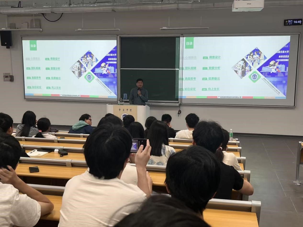 11月12日,广州跃数研网络科技有限公司副总经理吴长江、万人市场调查集团副董事长贾琤两位行业专家应邀莅临我院,开展了以市场研究与人才培养为主题的专题讲座。讲座由我院统计系主任王秋平主持,2025级应用统计专业研究生以及2023级应用统计学、统计学和2024级应用统计学专业本科生共同参与学习。