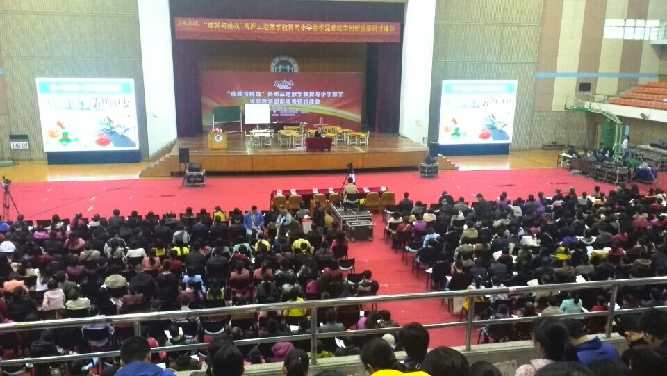 12月11日上午,为期三天的“成就与挑战”两岸三地数学教育与小学数学课堂教学创新成果研讨峰会在我校体育馆隆重开幕。峰会由广东名思教研主办,我校数学与统计学院承办。香港大学教授,国际数学教育委员会(ICMI)执行委员,国际数学及科学趋势研究(TIMSS)负责人,“弗赖登塔尔奖”获得者教授梁贯成;南京大学哲学系教授、博士生导师,著名数学教育专家郑毓信教授;上海电视台《超级家长会》栏目专家,上海思来氏信息咨询有限公司CEO张韫教授;我校王忠副校长出席开幕式并致开幕词。来自两岸三地数学教育界2800多人参加此次峰会。