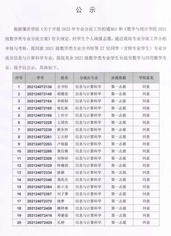 数学与统计学院2021级数学类专业分流结果公示