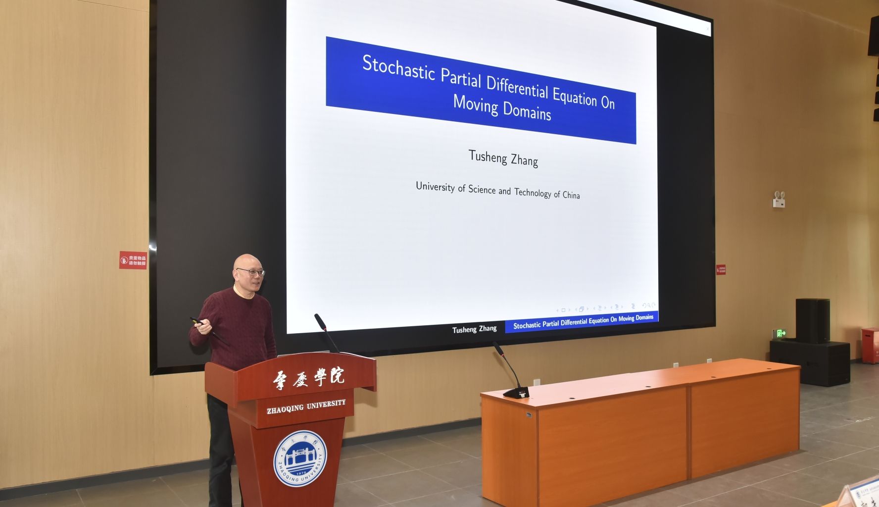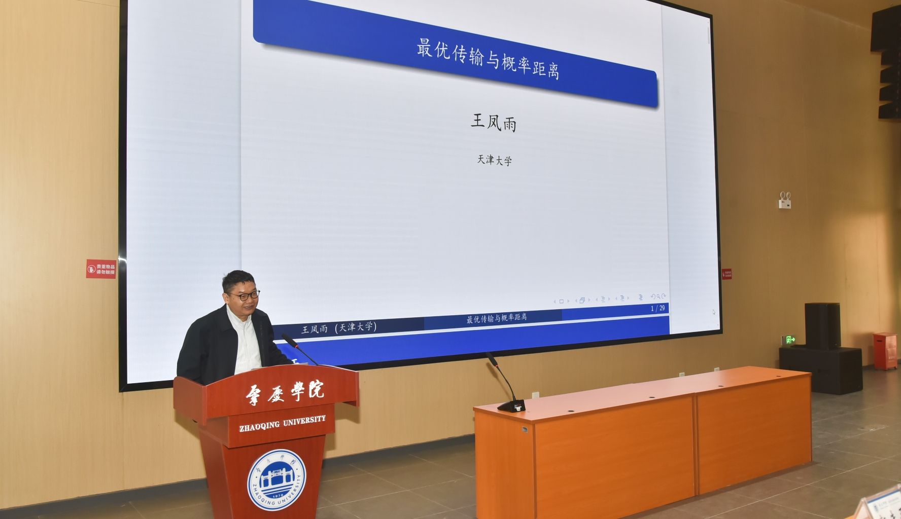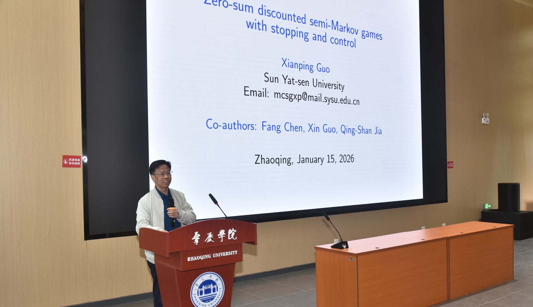 王凤雨教授作了题为”最优运输问题与概率距离的理论及应用”的专题报告、张土生教授分享了“Stochastic partial differential equations on moving domains”的研究成果、刘伟教授介绍了“Mean-field interacting particle systems and McKean-Vlasov equations”的相关进展、郭先平教授则围绕“Zero-sum discounted semi-Markov games with stopping and control”进行了深入讲解。这些高水平的学术报告为我院师生呈现了一场精彩的科研盛宴。本次系列讲座聚焦学术前沿动态,围绕相关学科的核心理论、研究方法及应用前景等展开了深入探讨。四位专家结合自身多年的科研经历与最新研究成果,分享了各自学术见解、解读了行业趋势,为在场师生提供了宝贵的学习交流机会。