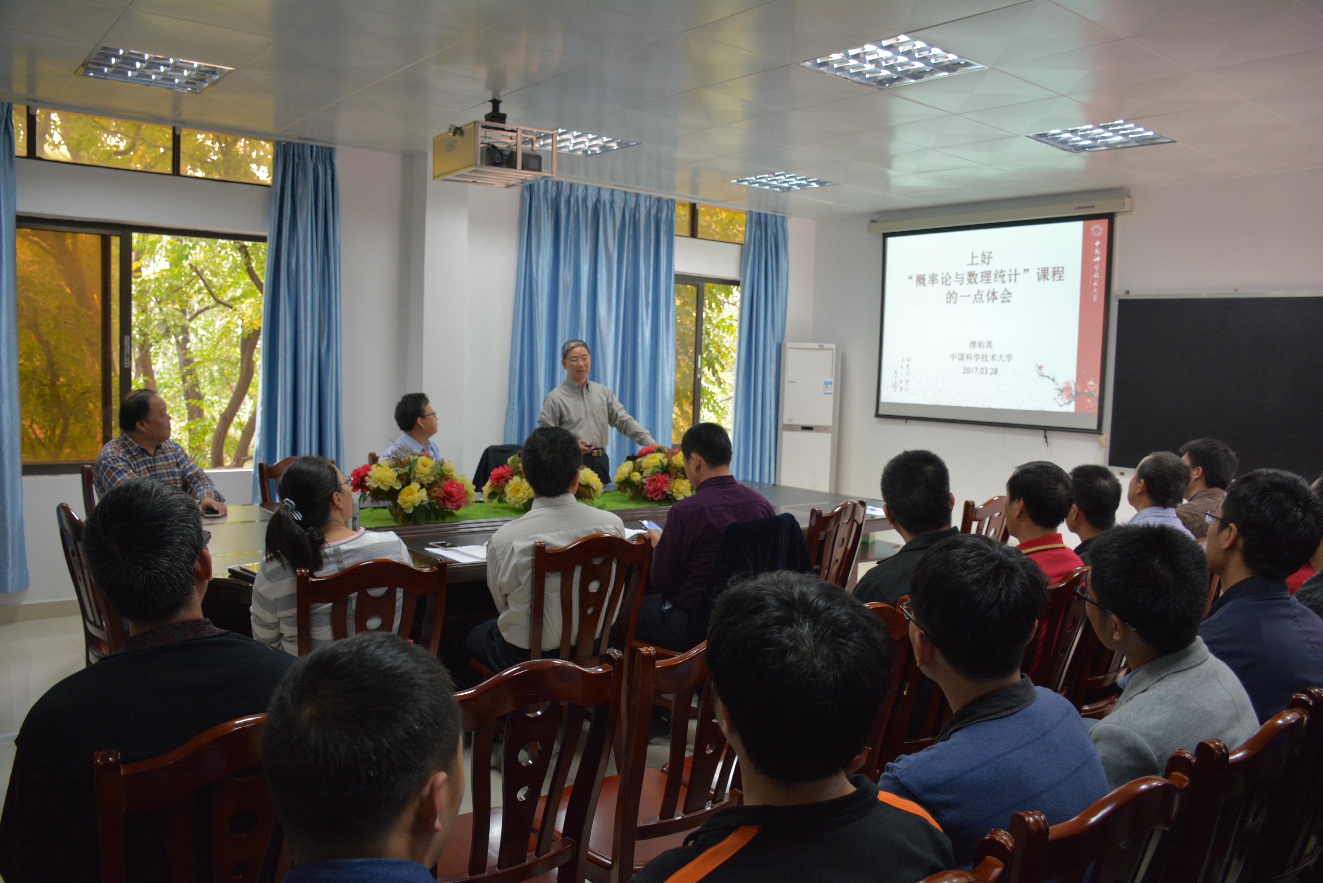 缪柏其教授的报告题为“上好《概率论与数理统计》课程的一点体会”。缪教授用统计方法分析了几个通俗易懂的案例,强调对数据要有敏感性。同时指出统计思想的重要性和培养大学生统计思维的迫切性,并分享了他对概率论与数理统计类课程教学方法改进的建议。缪教授风趣幽默的讲解,博得现场阵阵掌声。袁文俊教授就教学方法研究和精品课程建设等相关问题作了经验介绍。在报告的问答环节,我院教师就教学改革和课程建设的相关问题与两位教授展开了热烈的交流与讨论,现场气氛非常热烈。两位教授为我校概率论与数理统计课程和数学分析精品课程的建设提出了宝贵意见。