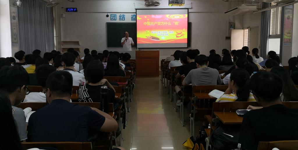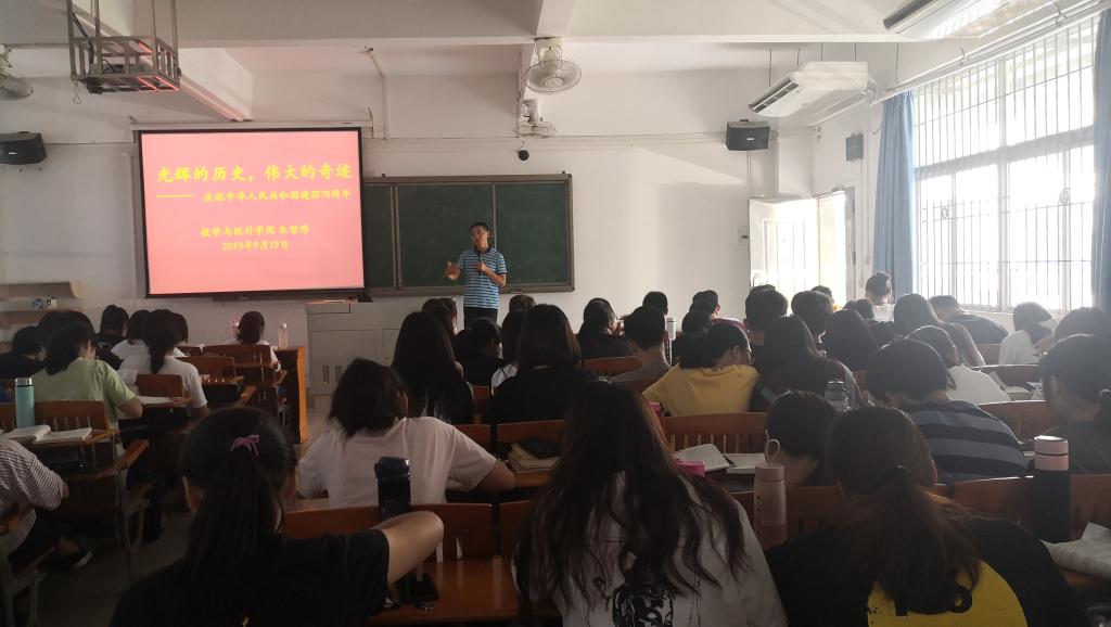 为庆祝新中国成立70周年,加强对大学生的爱国主义教育,增强大学生的报国志向,数学与统计学院党委书记杨帆和院长朱智伟分别在2019年9月17日和19日分别为我院18级金融数学班和18级数学与应用数学班同学讲授题为《中国共产党为什么“能”》和《庆祝中华人民共和国建国70周年》的思政第一课。