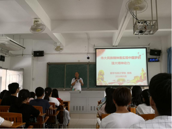 数学与统计学院党委书记杨帆和院长朱智伟在2018年9月10日和11日分别为我院17级金融数学班、17级应用统计班和17数本班同学讲授题为《伟大民族精神是实现中国梦的强大精神动力》和《社会主义核心价值观之公民层面价值准则》的思政第一课。