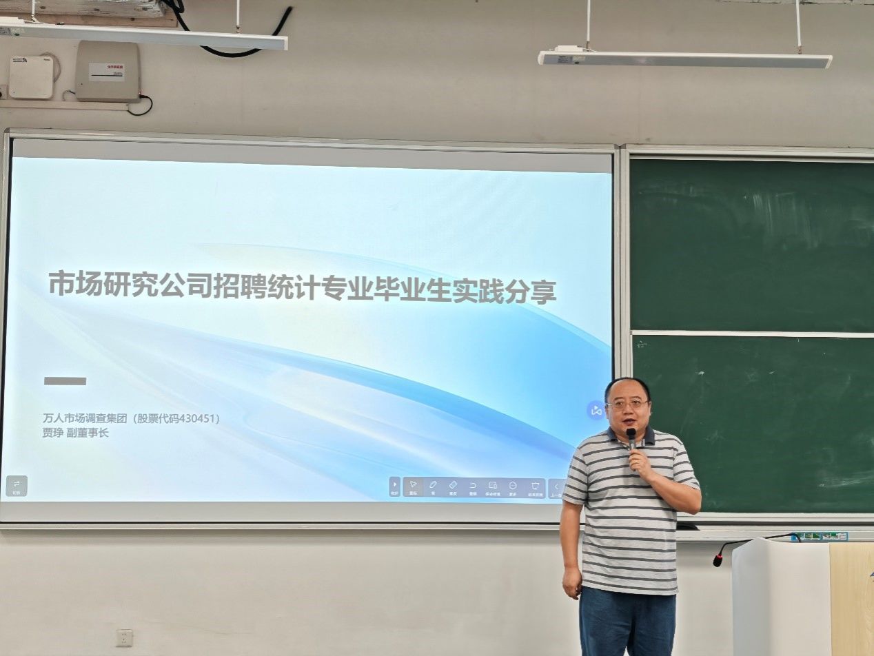 11月12日,广州跃数研网络科技有限公司副总经理吴长江、万人市场调查集团副董事长贾琤两位行业专家应邀莅临我院,开展了以市场研究与人才培养为主题的专题讲座。讲座由我院统计系主任王秋平主持,2025级应用统计专业研究生以及2023级应用统计学、统计学和2024级应用统计学专业本科生共同参与学习。