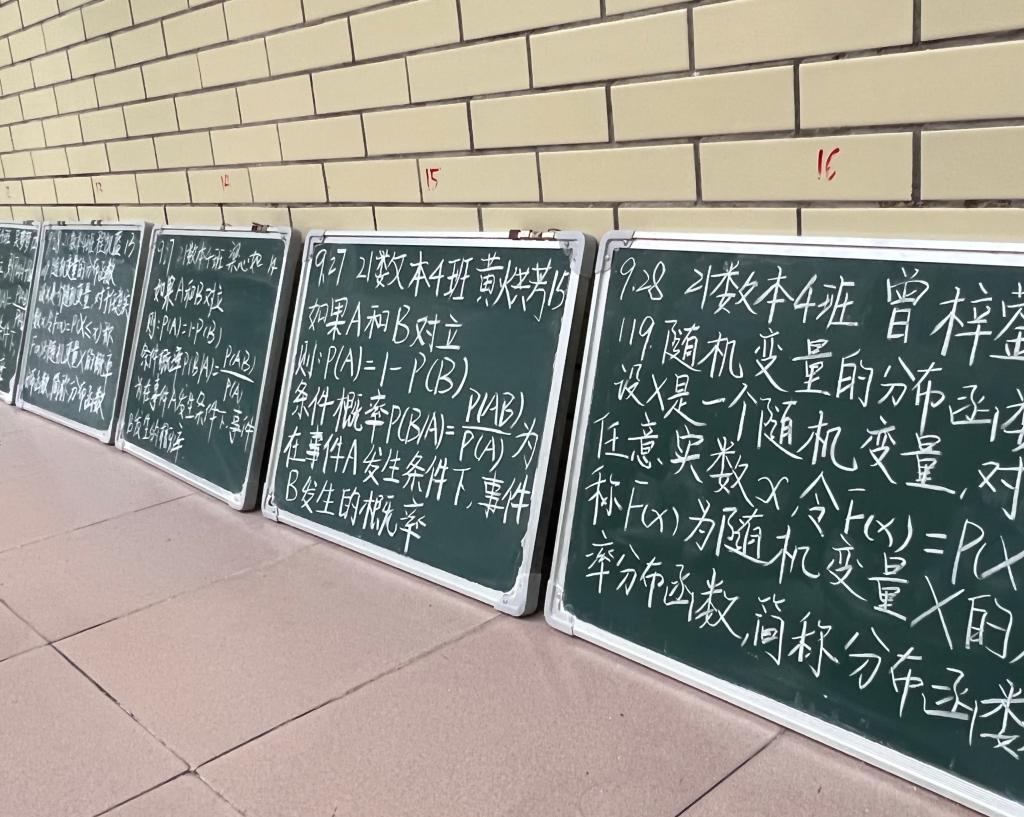 第一教学楼一楼走廊,整齐摆放着我院师范生的小黑板。粉笔字内容取材于一些数学知识和数学公式。每周周一到周五早上七点二十分前,师范生们把撰写好规定内容的小黑板放在自己学号位置。由班级班委负责考勤,学生朋辈辅导员和老师进行小黑板检查。若小黑板撰写字迹潦草或者内容有错别字则需修改。
