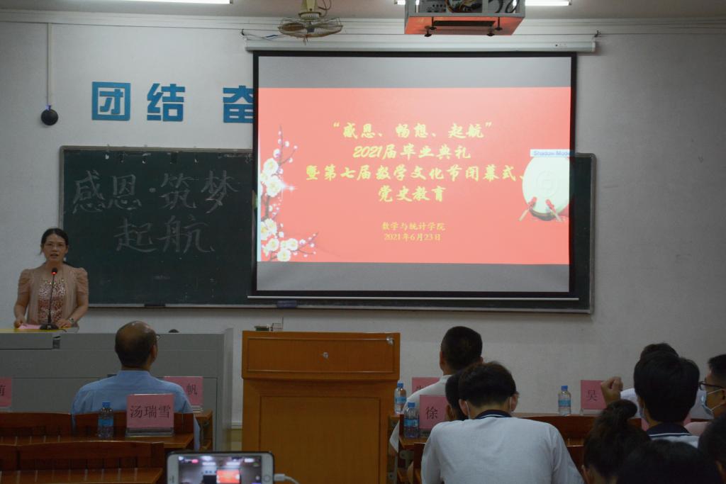 在这夏花盛放的六月份,为表彰过去一年做出贡献的学生,欢送2021届毕业生,激励学生不忘初心、砥砺前行,2021年6月24日下午,数学与统计学院于二教503课室举办了“感恩、畅想、起航”2021届毕业典礼暨第七届数学文化节闭幕式,出席本次典礼的有数学与统计学院杨帆党委书记、朱智伟院长、高洁云党委副书记、符和满副院长、吴晓副院长、程从华老师、柏萌老师、王肖义老师、徐勇老师、谷泽老师、陈建军老师、汤瑞雪老师、潘敏仪老师、张驰老师、曹阳老师、学生朋辈辅导员们、数学与统计学院在校2021届毕业生代表们、受表彰的同学们和2019级、2018级、2017级各班学生代表们。