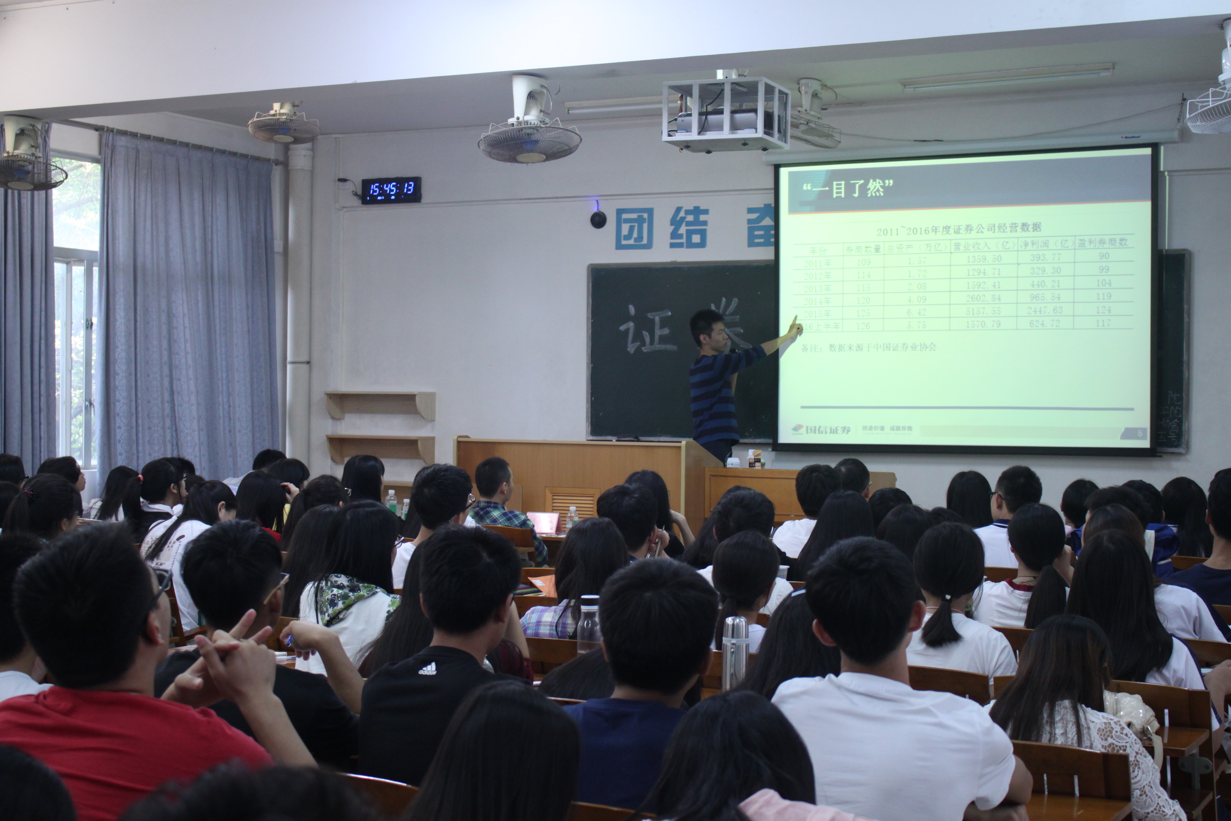 本网讯(通讯员陈琪琪)11月5日下午15:30-17:30分,金融数学与统计协会于第二教学楼205举办了证券投资培训课以及动员大会。出席本次培训课的嘉宾有本协会的指导老师吴晓、国信证券股份有限公司投资顾问陈镔和国信证券股份有限公司渠道经理梁家健等。