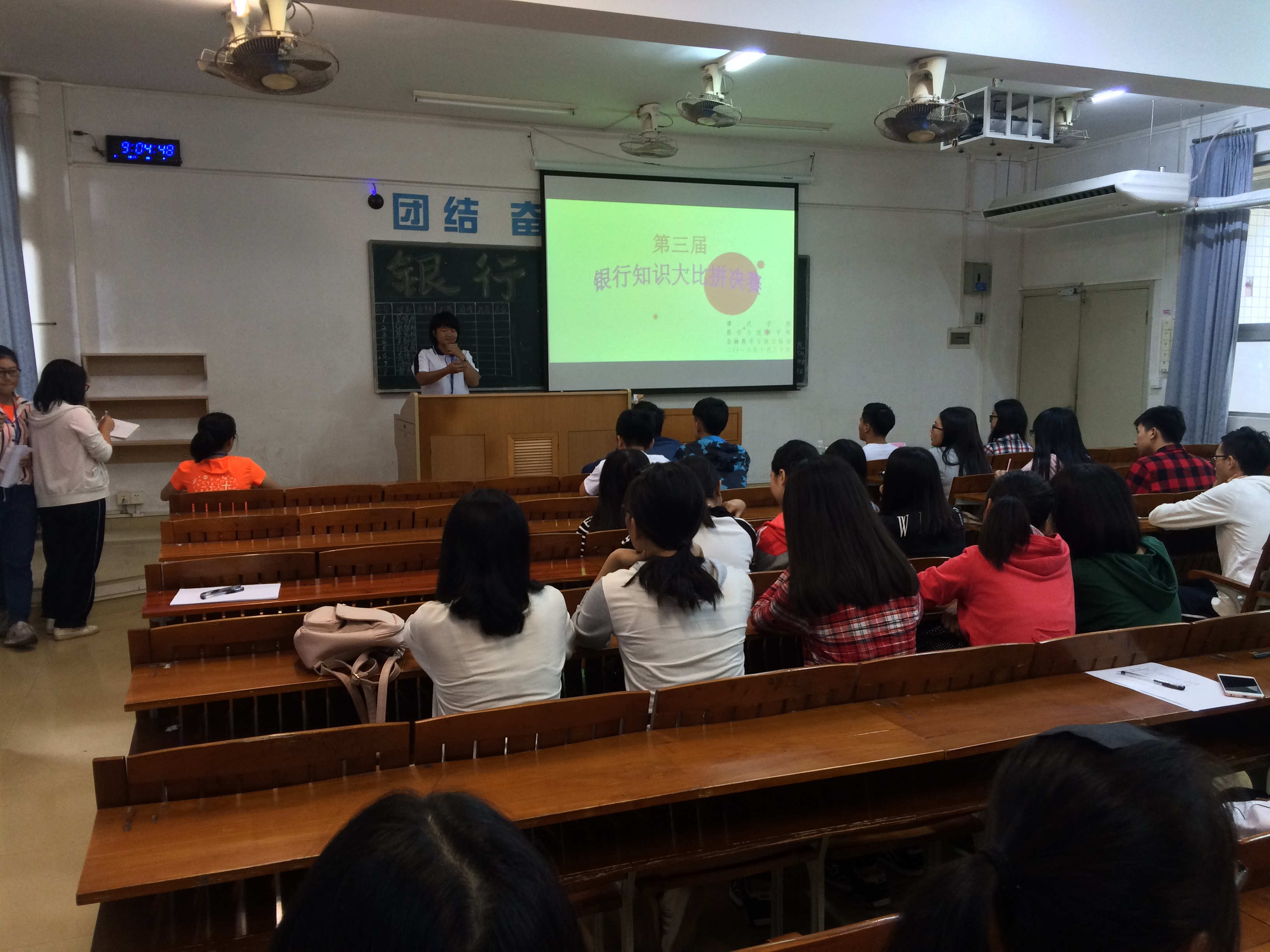 本网讯(通讯员:梁燕梅)2016年10月30日上午9点,由数学与统计学院金融数学与统计协会承办的“第三届银行知识大比拼”决赛于第二教学楼205教室举行。莅临本次比赛的嘉宾有程序设计协会前会长秦书楠,建模协会会长吴晓芸和金融数学与统计协会会长周漫莹。秦书楠师兄还给我们的比赛做了精彩的点评。