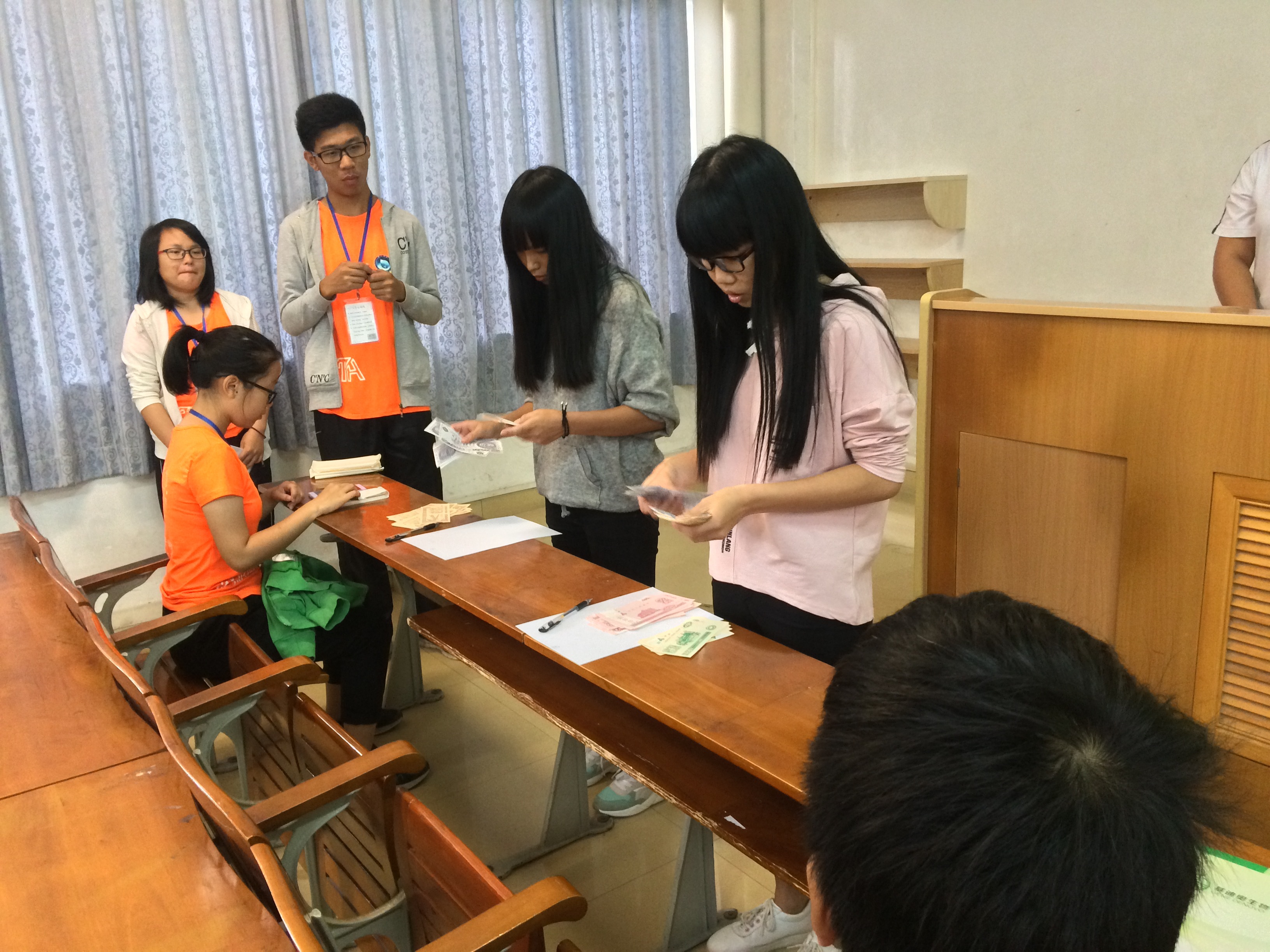 决赛有四个环节,第一环节是点钞,把从初赛中脱颖而出的八名选手分为四组进行PK,决胜的四名选手进入第二轮的点钞PK;第二环节是必答;第三环节是进行轻松愉快的“你画我猜”游戏,活跃了一下之前严肃的气氛;第四个环节是最激烈的抢答,每位选手都积极地作答。经过这四个环节的角逐,各位选手大展拳脚,热情参与。最终,令人庆贺的是15信息班简培尧获得一等奖,15金融1班李倩怡和16应统班吴晓丹获得二等奖,16数本蔡菀怡、16统计班雷丽莹和16统计班吴舒霞获得三等奖。