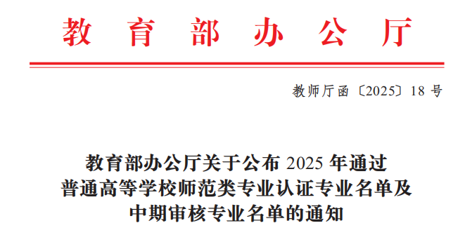 近日,教育部办公厅公布了2025年通过普通高等学校师范类专业认证专业名单及中期审核专业名单(教师厅函〔2025〕18号),我校数学与应用数学、物理学专业正式通过教育部师范类二级认证,有效期从2025年9月到2031年8月。截止目前,我校正式通过教育部师范类二级认证的专业增至4个。随文还公布了我校化学专业通过了中期审核,继续保持认证有效期。